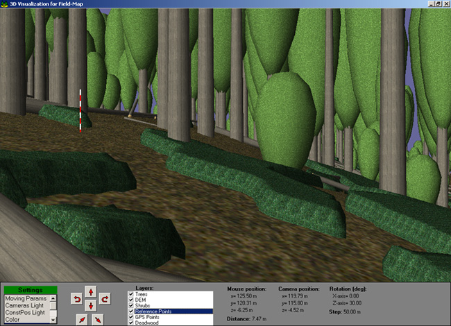 Le Field-Map 3D Forest représente une extension qui a été développée afin de pouvoir visualiser les données du Field-Map en trois dimensions. Les données de la cartographie et des mesures des arbres sont tirées directement de la base de données Field-Map.