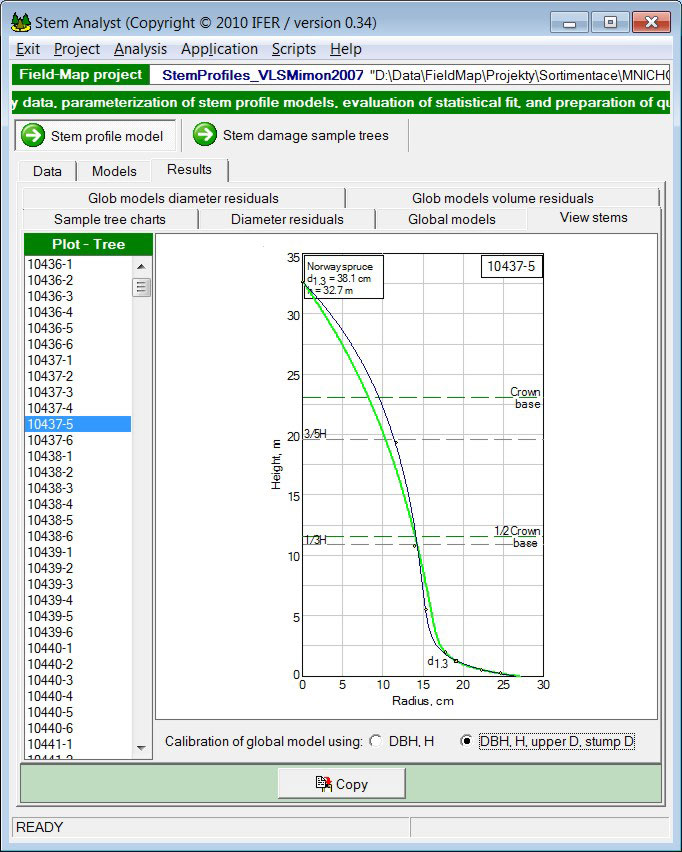 The parameters for the global stem curve model are defined based on measured stem profiles. You can measure sections of felled trees or use the so-called six-point method on standing trees.
